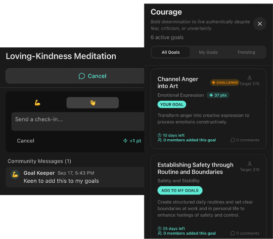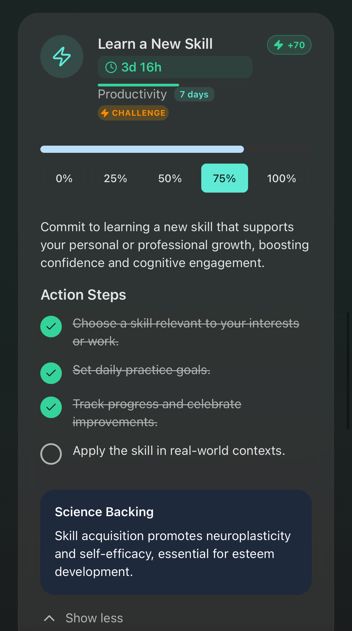 Unique personalised goals and challenges designed to improve your consciousness level.