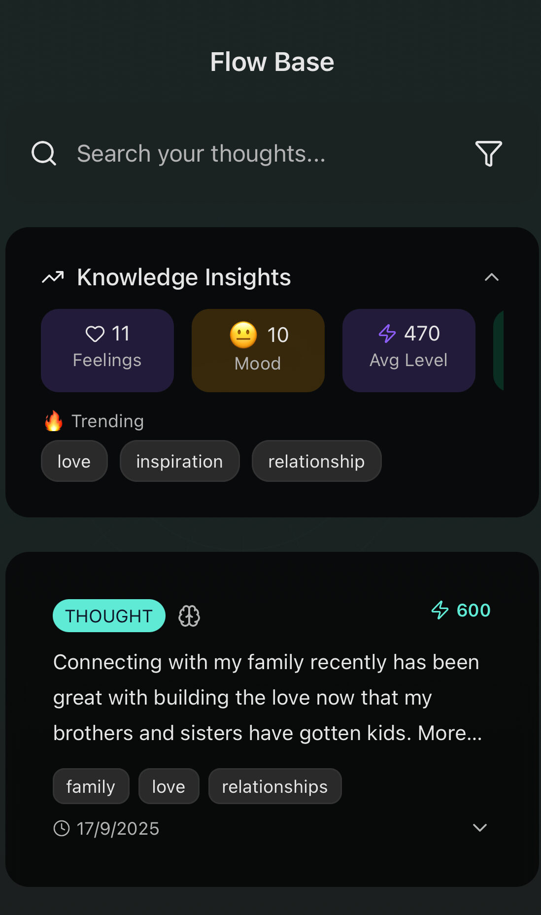 Capture thoughts, feelings and observations. Each analysed and added to your “Flow Base”.